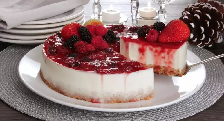 8- Desenforme a cheesecake, cubra com a calda, decore com frutas vermelhas e sirva em seguida.